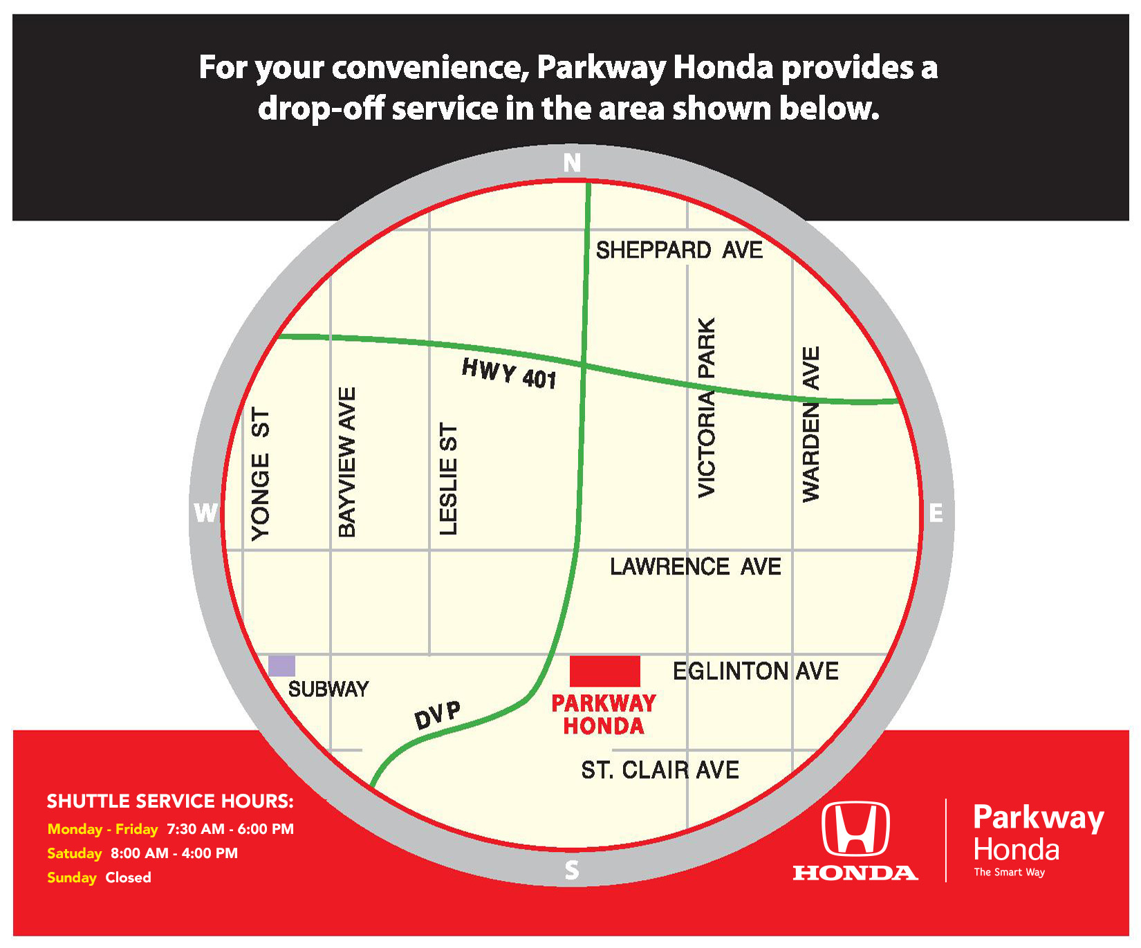 Our complimentary shuttle service is available Monday to Saturday. To provide an efficient service to all our customers, our shuttle service operates within a 10 minutes radius from our dealership. Please check the image below to know more details about the drop-off area and hours. If you have any questions about this service, please don’t hesitate to give us a call.